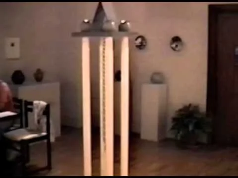 This series of works began with the simultaneous pondering the way we meter time (relative to the millenium's end) and subsequent discovery and aquisition of some old tube-based electronic metronomes that clicked and flashed. They were made in Hartford Connecticut in the early sixties and perhaps the late fifties. I took them apart and reassembled them so they would fit inside units of these sculptural assemblages.